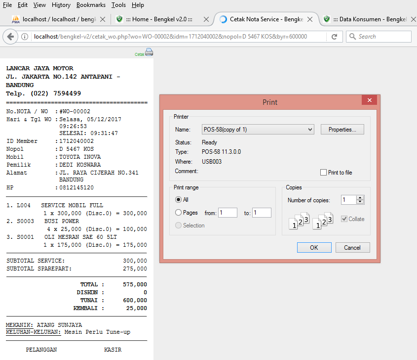 - Cetak Nota Service & Penjualan Sparepart langsung menggunakan mini Printer 80mm
